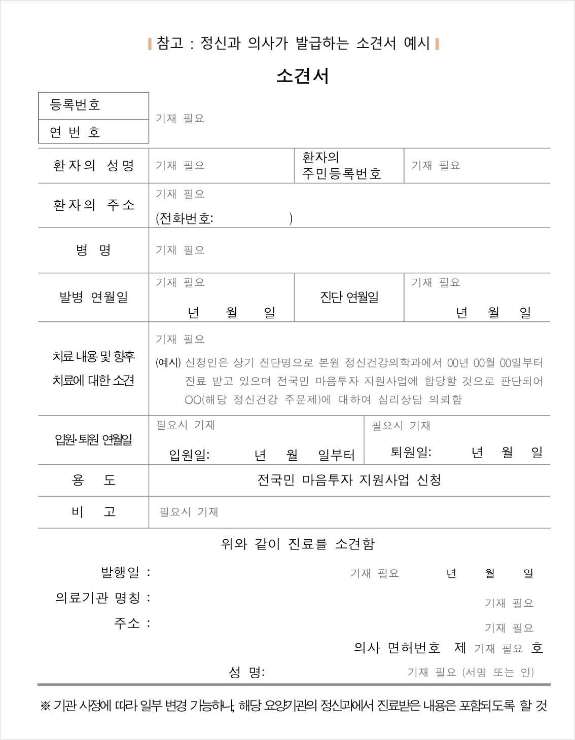 👉🏻 정신과 의사, 한방신경정신과 한의사가 발급하는 진단서 또는 소견서(신청일 기준 3개월 이내) (서류예시화면)